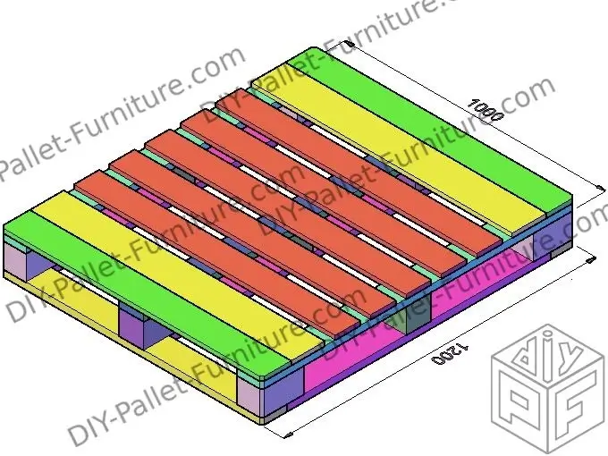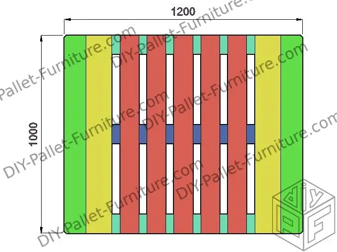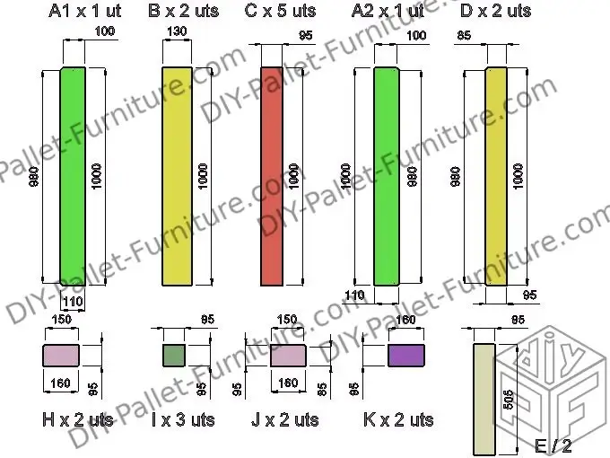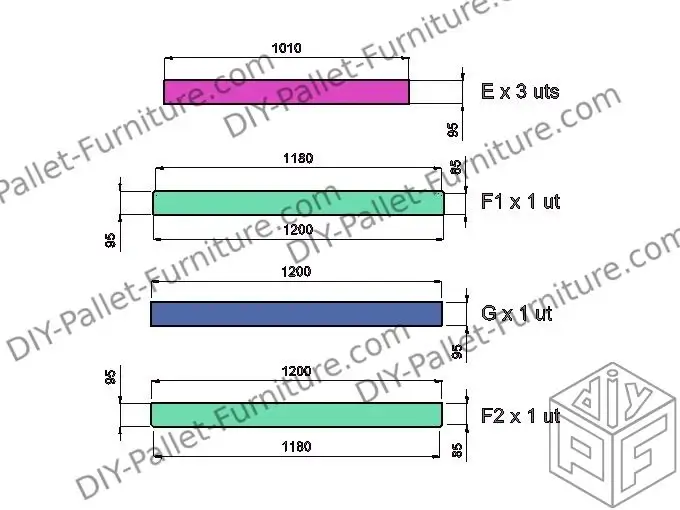 Here you have a view of the pallet we are using for this furniture along with an exploded view of the pallet itself. That way you can locate each one of the parts used for the model. Note that some parts might not be used for this specific model.