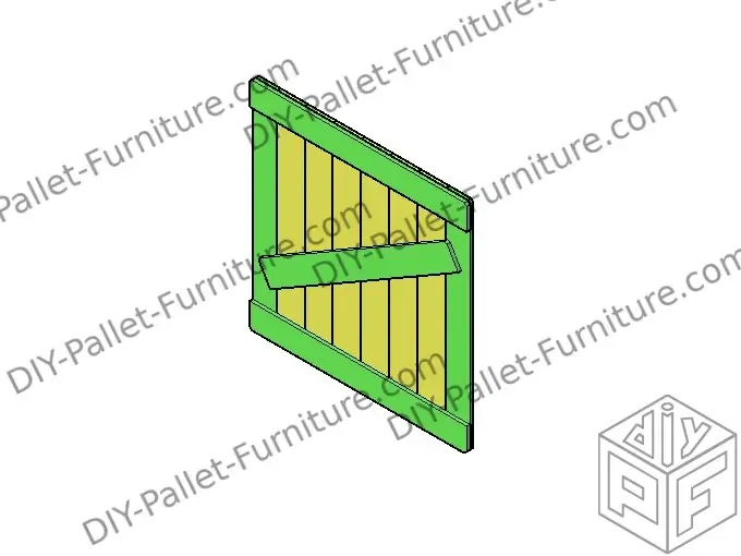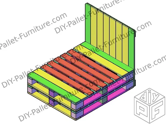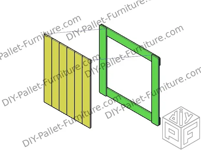 The first step is to build the backrest of the pallet. To do that we will build a very simple structure using 4 wooden strips (green color) and create inside of it a surface using 6 yellow strips.