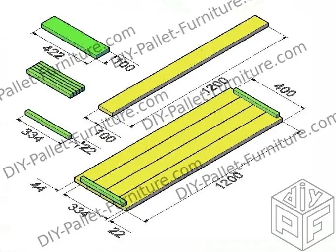 Here you have a view of the pallet we are using for this furniture along with an exploded view of the pallet itself. That way you can locate each one of the parts used for the model. Note that some parts might not be used for this specific model.